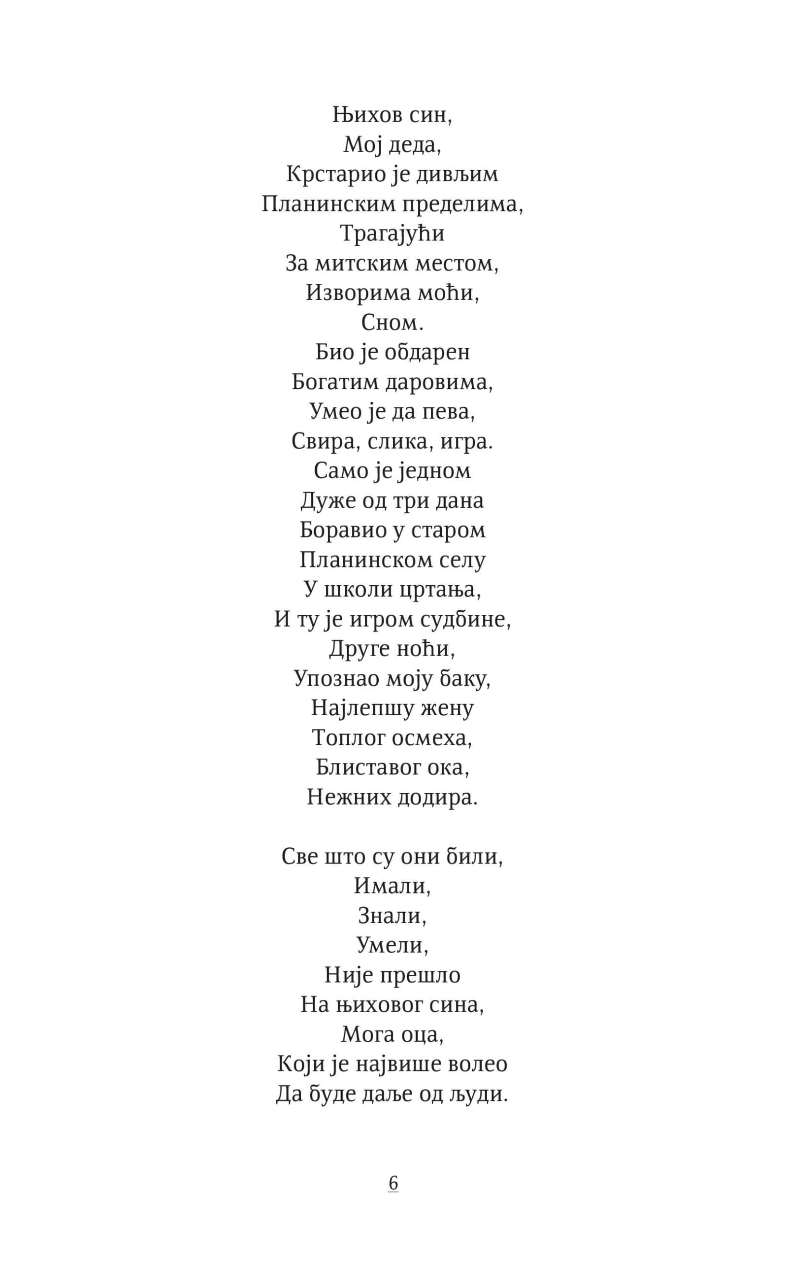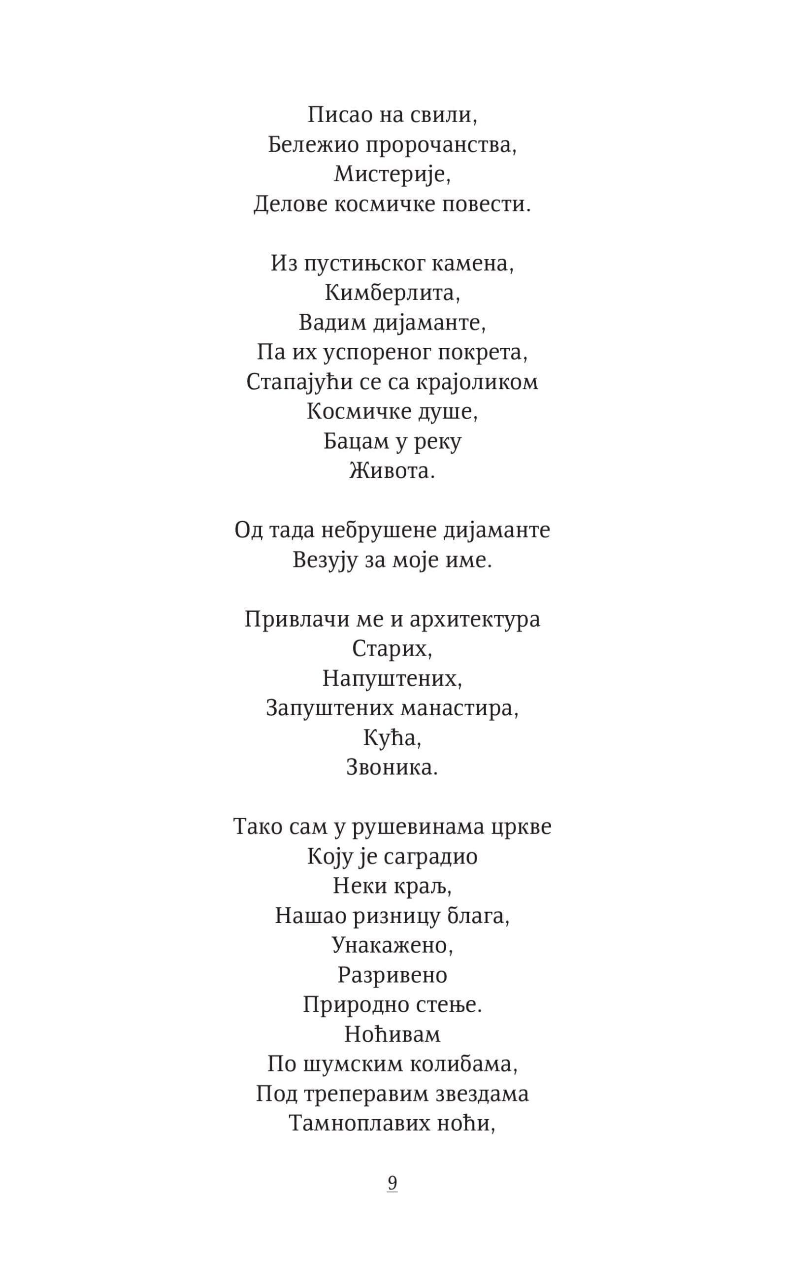 Као својеврсно мистично искуство и борба против заборава, у њој се отвара могућност трагања за божанским кроз људску крхкост. У њој се не траже готови одговори, већ се сва битна питања чувају жива, отворена, као путокази ка проналажењу вечне лепоте у једноставним, тренутним стварима и догађајима.