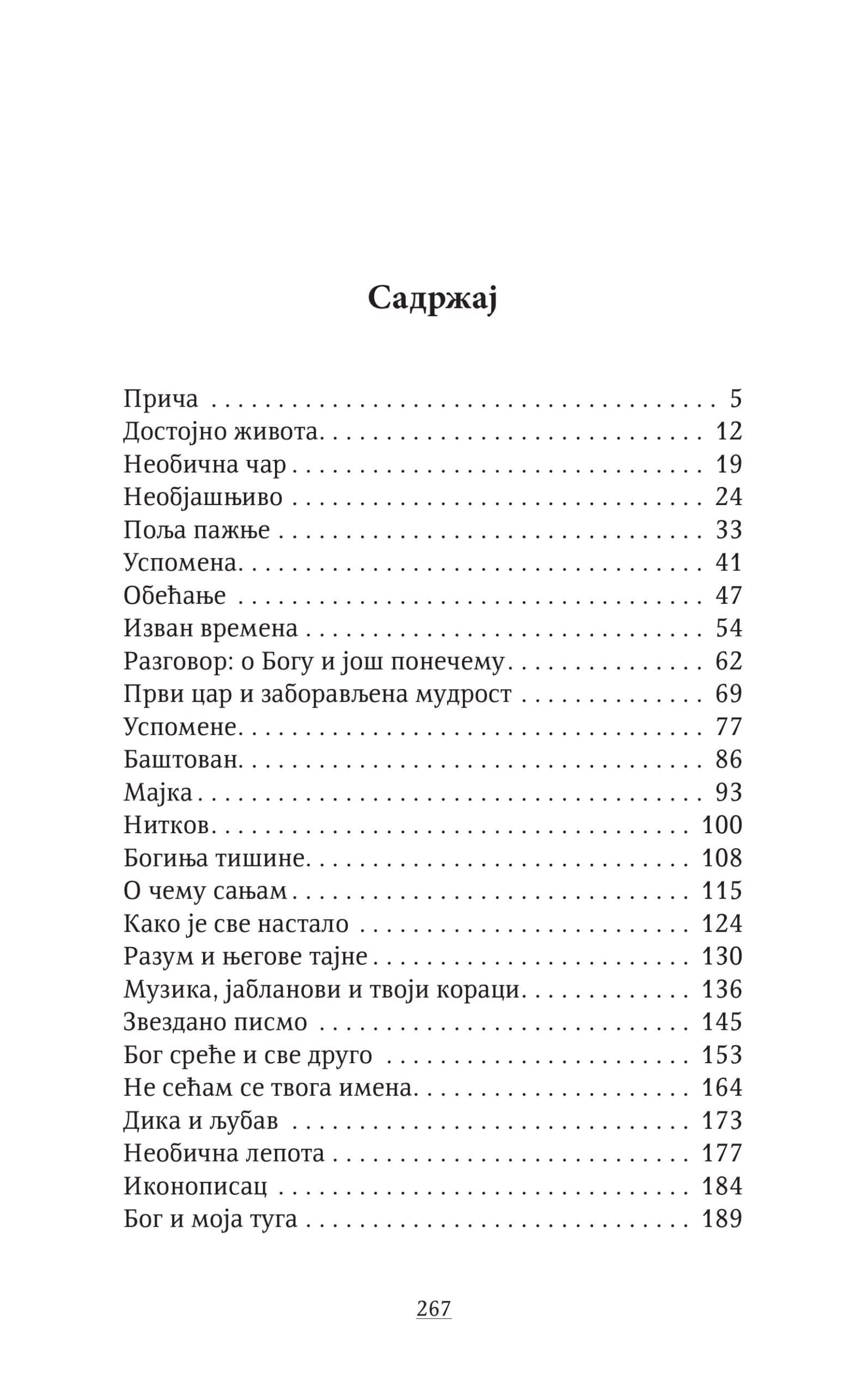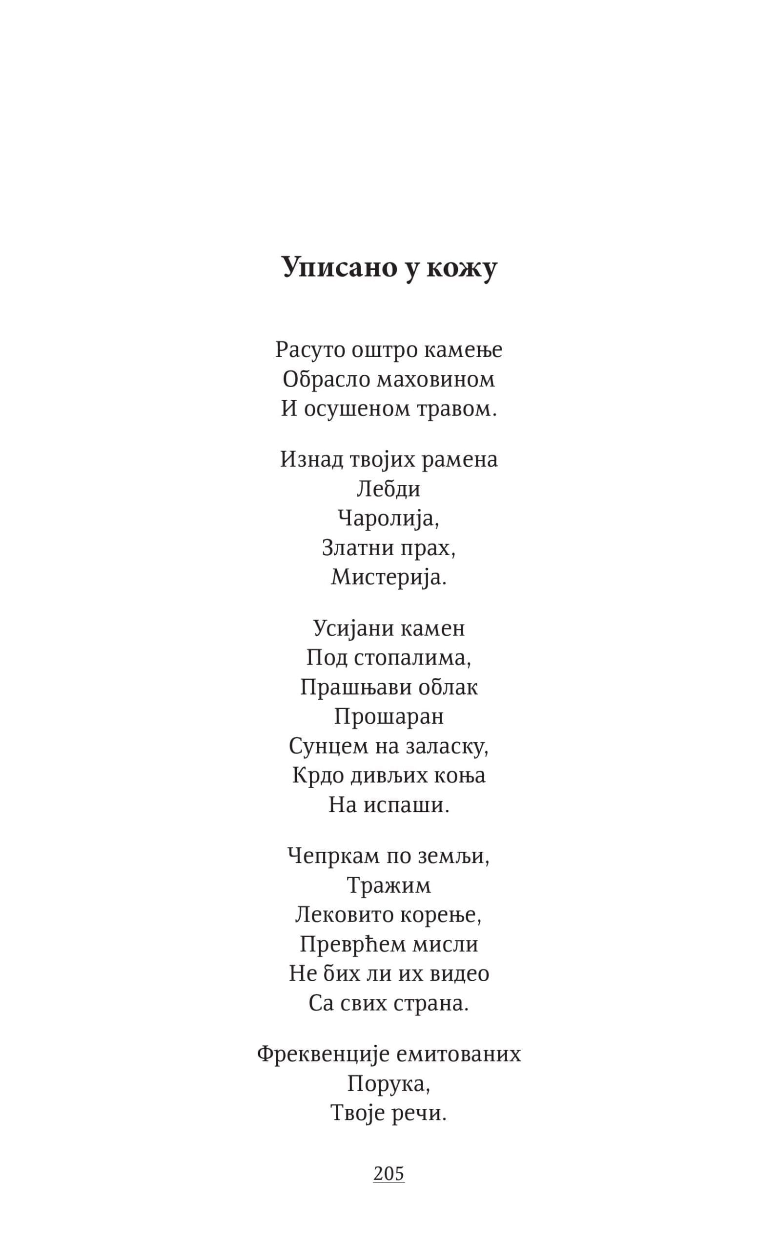 Она се дотиче туге, љубави, пролазности, потраге за смислом и човековим односом према природи и судбини. Немогућност потпуног разумевања живота уводи нас у контрасте између чулности и апстракције, пролазности и трајности, сумње и вере, светлости и таме.