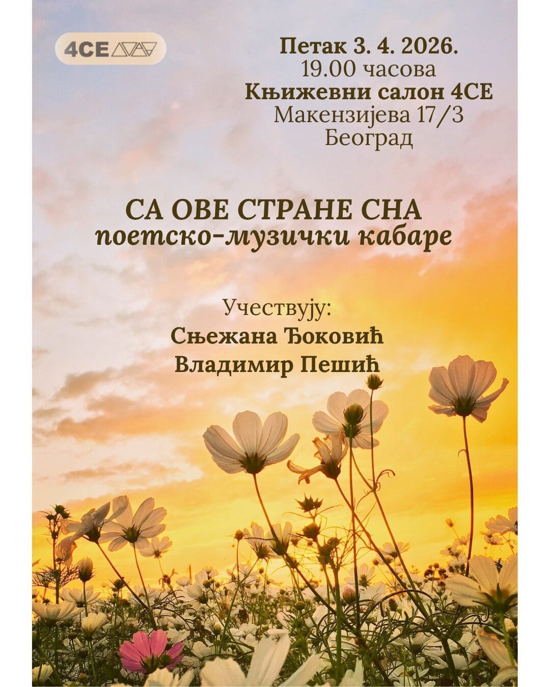 Издавачка кућа 4СE са задовољством најављује поетско-музички кабаре под називом „Са ове стране сна“, који ће бити одржан у Књижевном салону 4СE.